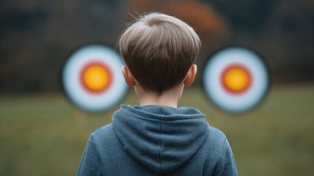 A young boy stands with his back to the camera, focusing intently on two archery targets in an outdoor setting, capturing the essence of skill and determination.