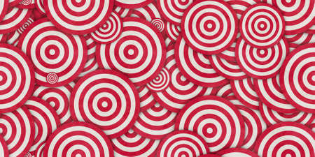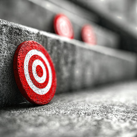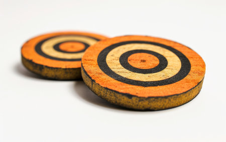 Three circular targets with alternating red and white rings are presented against a neutral background. The design features a symmetrical composition and highlights the center points. The lighting creates subtle shadows. These visuals might be used for concepts related to accuracy, focus, or business goals.