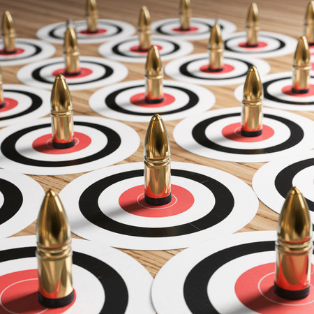 Many bullets with shooting targets on white table in shooting range polygon. Training for aiming and shooting accuracy