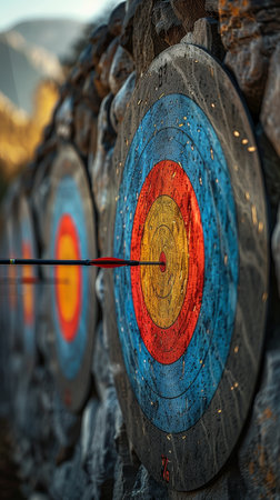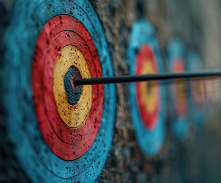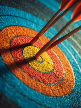 A striking close-up view of arrows embedded in a target at an archery range, showcasing the precision and focus required for the sport. The blurred background adds depth.