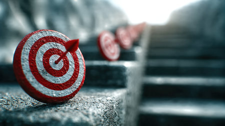 Illustration of a man climbing stairs towards a target with an arrow in the bullseye, symbolizing goal achievement and success.