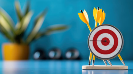 A vibrant dartboard set featuring colorful arrows set against a bright blue background. This image embodies themes of target achievement, focus, and motivation, perfect for conveying success and strategy in a dynamic visual.