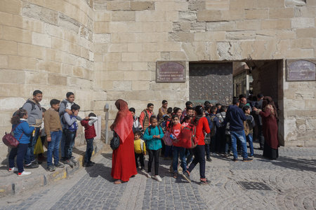 Alexandria, Egypt: Egyptian school children wait to enter the Qaitbay Citadel, established by Sultan Qaitbay in 1477 AD on Pharos Island.