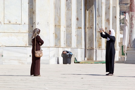 Arab women with traditional dress are visiting the mosque and taking photographs at the Temple Mount, Jerusalem, Israel