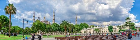 Istambul, Turkey – 07.12.2019. The Sultan Ahmad Maydan with the Blue Mosque in background on a cloudy summer day, Istanbul, Turkey