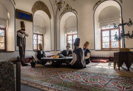 KONYA, TURKEY - 10 FEBRUARY 2016: wax dervish statues in the Mevlana Museum, February 10, 2016 in Konya, Turkey. Tomb of Mevlana, the founder of Mevlevi sufi dervish order.