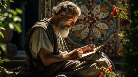 Greek philosopher meditating in a mosaic-adorned garden