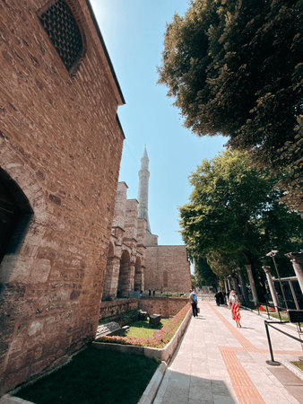 ISTANBUL, TURKEY - AUGUST 12, 2019: Tourists at Ayasofia mosque in Istanbul, The Hagia Sofia is one of the main attractions of the city