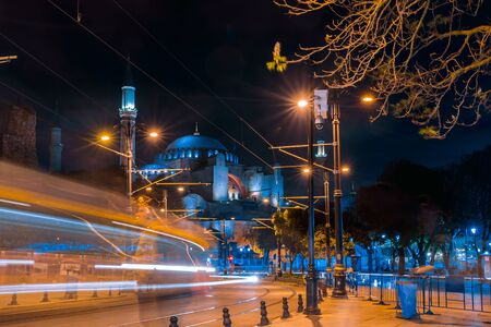 Streets of the old city in Istanbul at night. Tram line next to the Hagia Sophia. The photo was taken using a long shutter speed. Night Traffic in Motion.