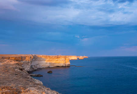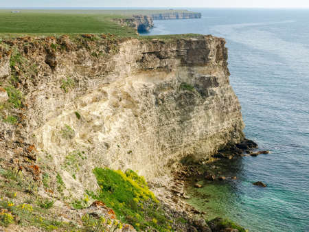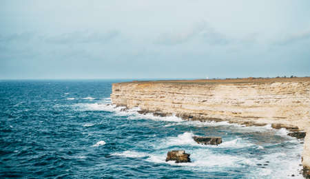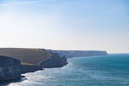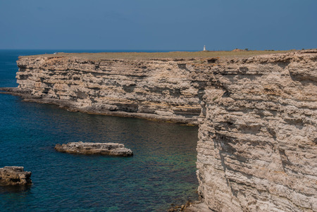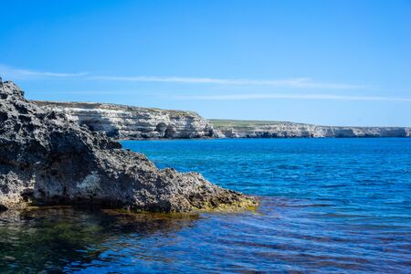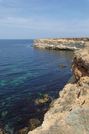 The steep and steep coast of Cape Tarkhankut and the deep Black sea in Crimea. Sunny day