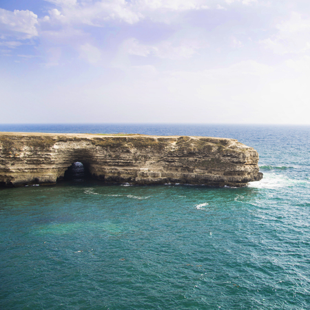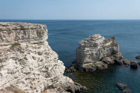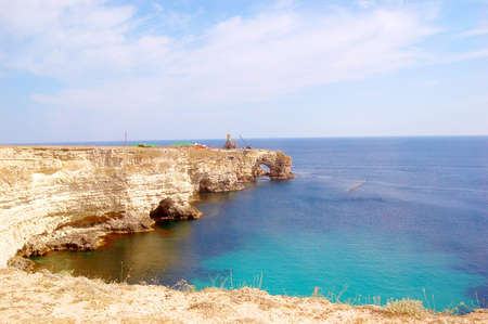 Crimean landmark: Cape Tarkhankut with beautiful rocks on the background of the sea and sky.