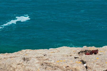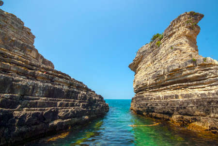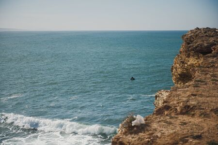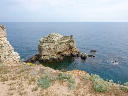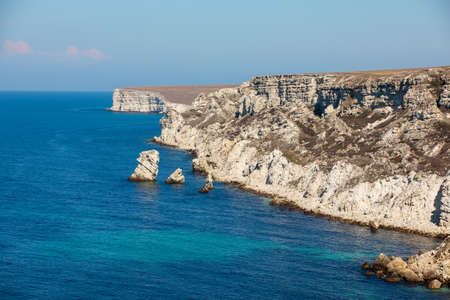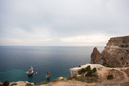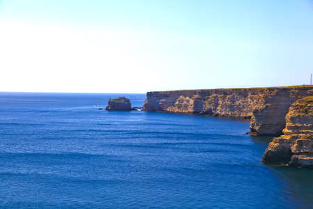 Beautiful view from the cliff on the blue sea. Incredible coast with freestanding cliffs in the sea. Cape Fiolent, Crimea.
