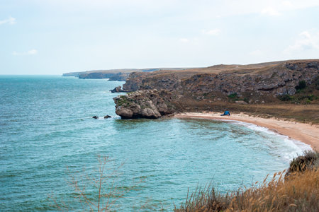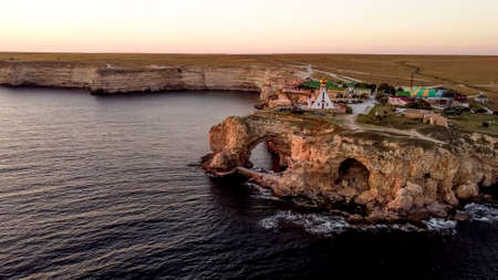 Tarkhankut, Crimea, Russia-September 11, 2019: View from the Cup of Love towards the Fishing Camp in Atlesh Park. Colostrum Tarhankut in Crimea