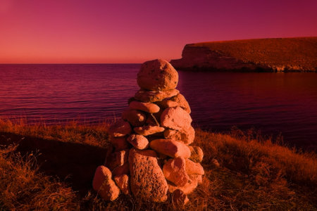 Cairn of cobblestones on a steep seashore. An ancient navigation sign for seafarers. IR filter