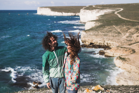 Copuple walking along the coast together. Strong wind in curly hair and funny mood