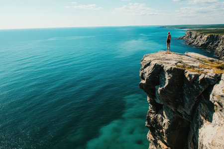 A person stands confidently on a rocky cliff edge, gazing out over a tranquil ocean. The bright blue water and clear sky create a peaceful midday atmosphere.