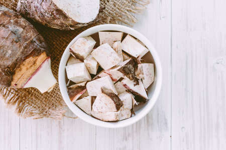 Taro slices and cube was cuted for cooking new dishes on white and wood background.