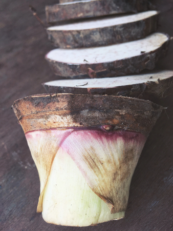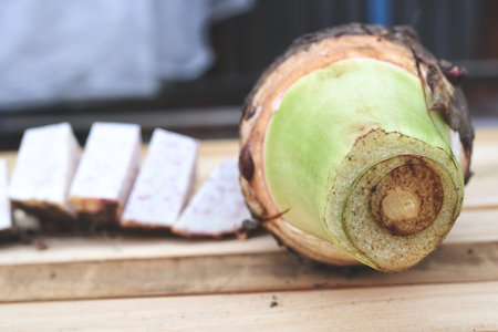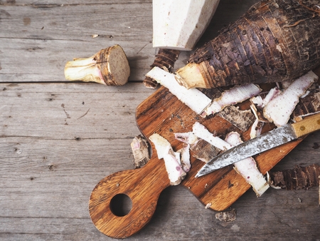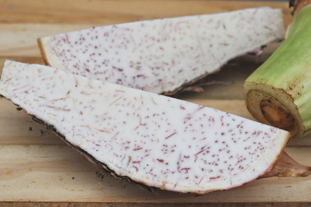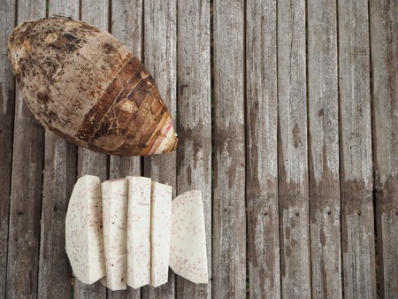 Taro root on wooden background
