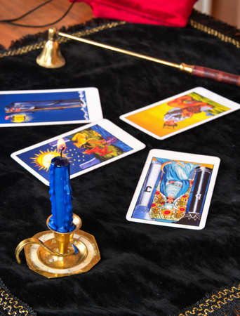The concept of divination, magic and esotericism. Cards candle on Cartomancy and fortune telling table. high quality photo