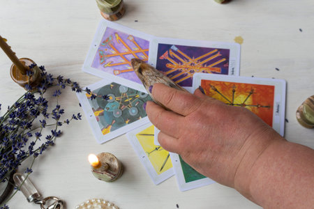 tarot cards, fortune telling rite with occult and esoteric symbols.