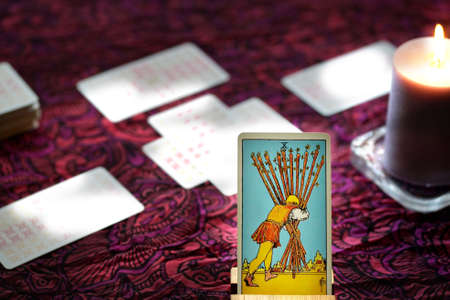 Tarot card reader arranges cards in a card spread.Fortune-telling on traditional tarot cards on the table with a candle. ... High quality photo