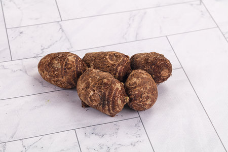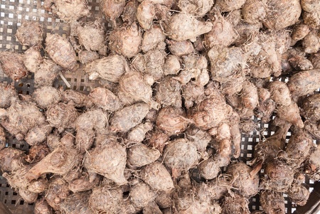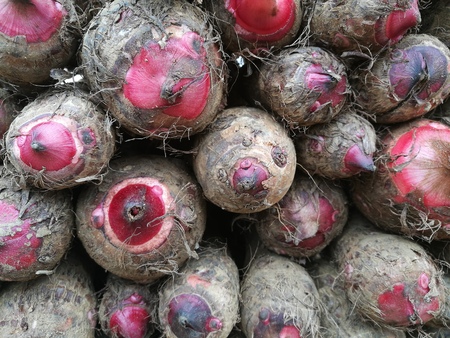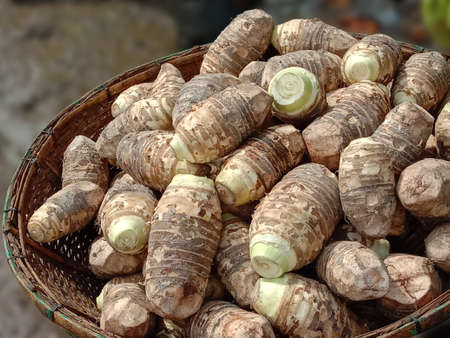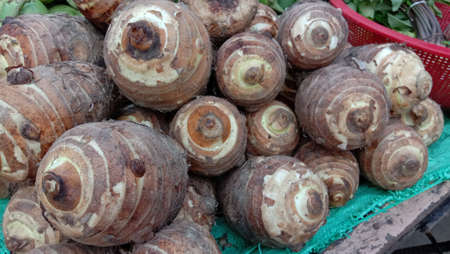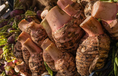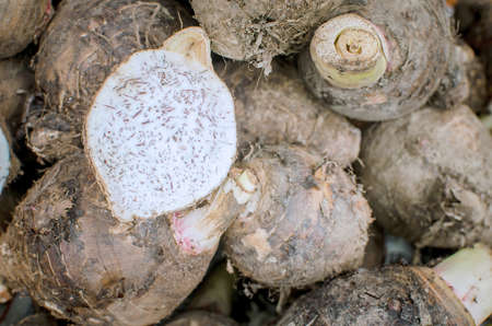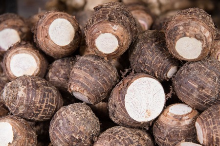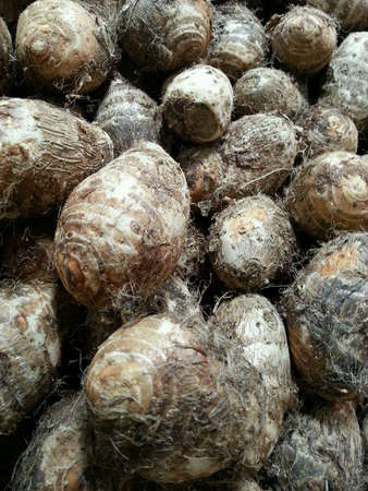 Background of pile of fresh organic taro displayed at a flea market in Asia