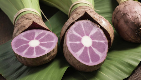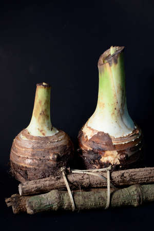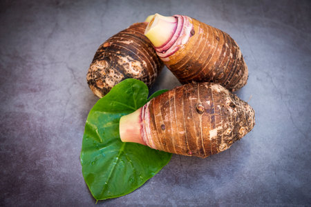 Taro root on taro leaf and dark background, Fresh raw organic taro root ready to cook