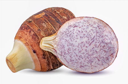 Taro root with green sprouts and slices showing textured brown skin and purple speckled flesh on a white...