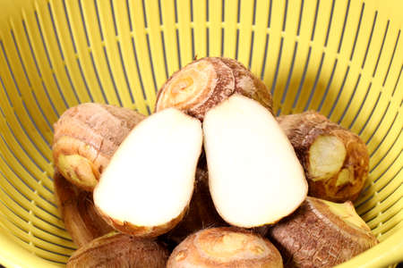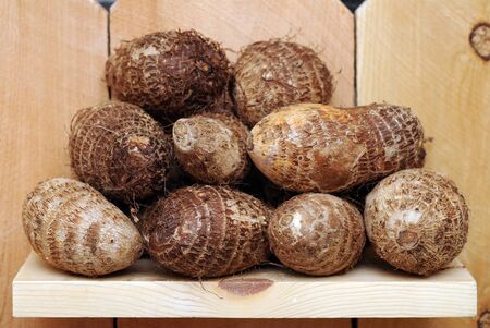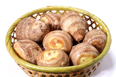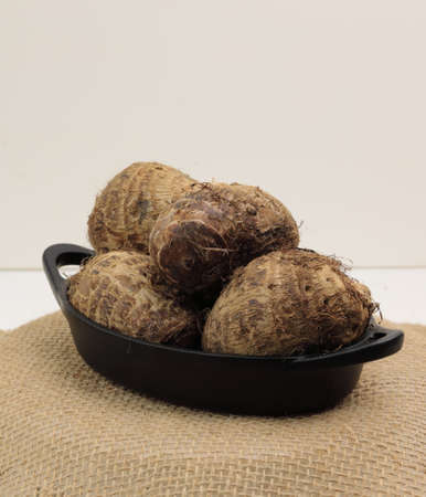 A conatiner with Taro roots or Colocasia or yams with accomodation for copy space.