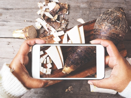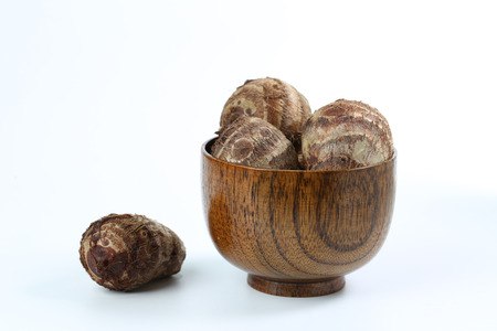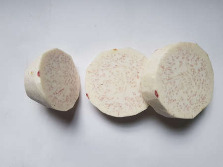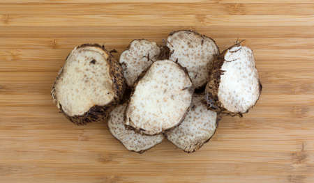 Taro slices and cube was cuted for cooking new dishes on white and wood background.