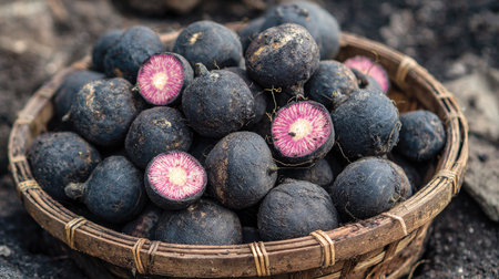 A close-up captures a collection of round, dark berries arranged inside a rustic woven basket. Some berries are sliced, revealing vibrant pink interiors against their deep-purple exteriors. The composition showcases a shallow depth of field, with soft lighting enhancing the textures, perfect for various commercial projects and editorial usage.