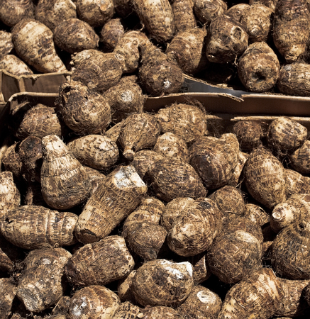 Pile of raw, unpeeled tropical Eddoe corms, Colocasia antiquorum, on a UK market stall