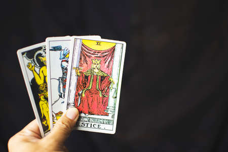 Rayong Province,Thailand - December 16 2019, The Justice card tarot and other in a left hand of fortune teller for fortune telling predict.