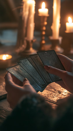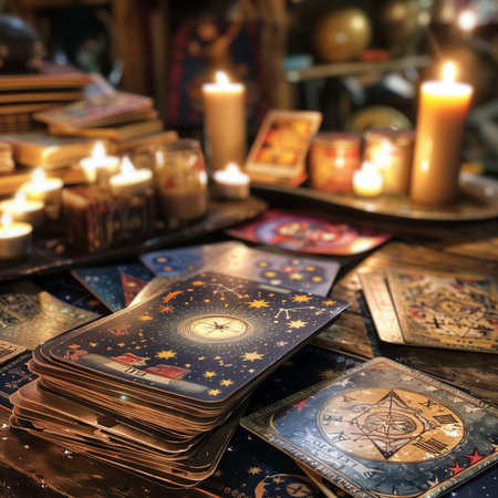 Candles illuminate tarot cards spread on a table, enhancing the mystical atmosphere for learning