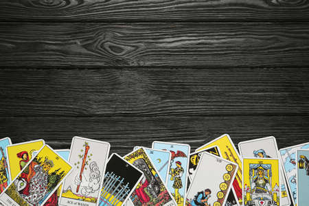 Ukraine Dnipro 08/25/2021 - Divination tarot cards on the table as a background, divination by tarot cards, magic and witchcraft