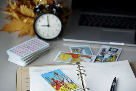 Tarot cards on the table. Fortune telling concept with occult and esoteric symbols. High quality photo