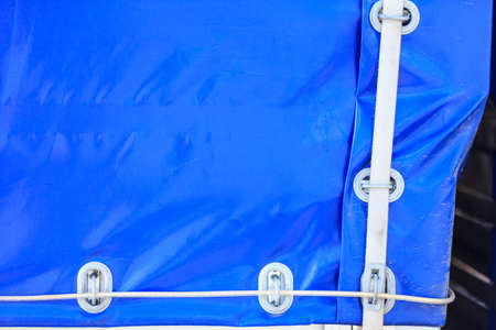 Detailed close up of blue tarpaulin with wires and ropes. Truck details concept.
