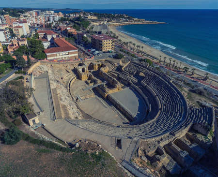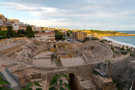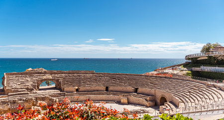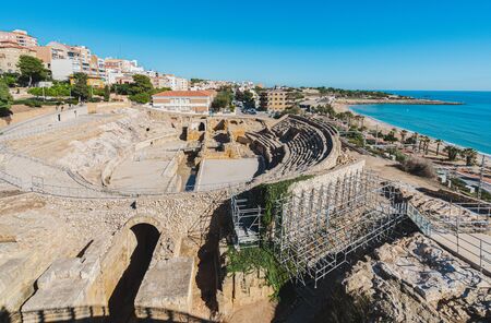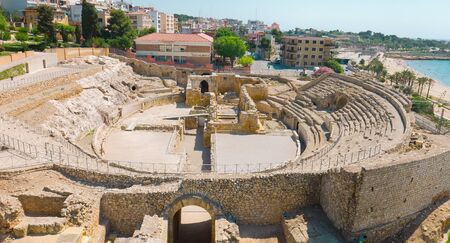 TARRAGONA, SPAIN - MAY 1, 2017: View of the ancient roman amphitheater and the sea. Copy space for text