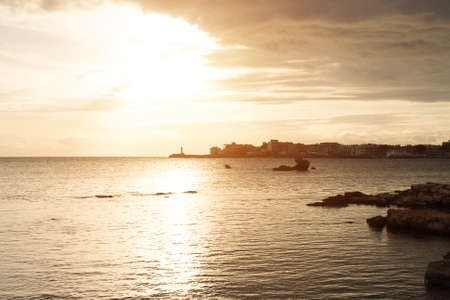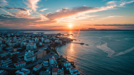 Drone point of view Torrevieja city coastline. Glowing sun illuminate Mediterranean Sea during early morning scenery. Province of Alicante, Costa Blanca, Spain