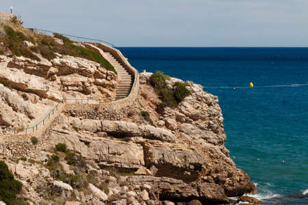 Rocky seashore. Stone staircase on the mountainside. Picturesque sea landscape. Summer seascape. Spain.