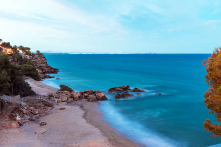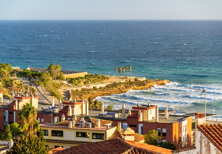 View from terrrasy on coastline of the Costa Dorada, Tarragona, Catalunya, Spain. Copy space for text