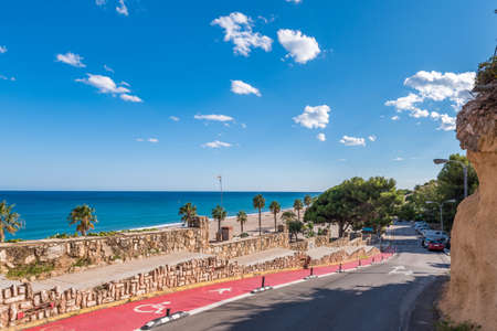 The road along the coast of the Costa Dorada in Miami Platja, Tarragona, Catalunya, Spain. Copy space for text