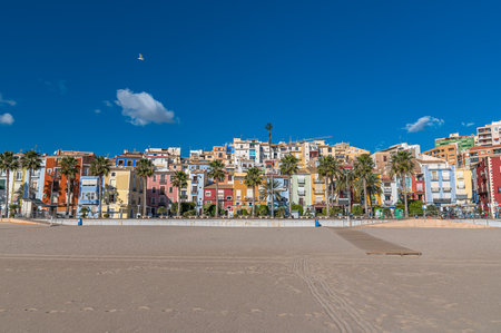 Buildings with colorful facades seen from the beach in Villajoyosa, Alicante province, Valencian Community, Spain