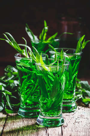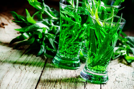 Green fizzy drink with tarragon, vintage wooden background, selective focus