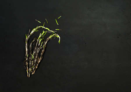 Fresh rosemary herbs isolated on black background. Culinary healthy aromatic herbs. Culinary arts.
