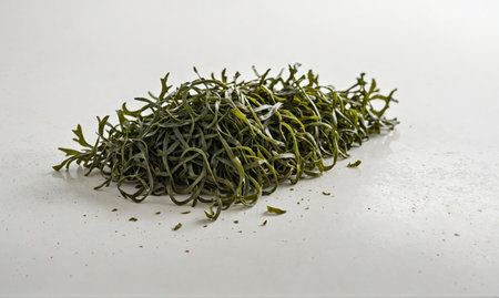 A pile of dried seaweed sits on a white surface