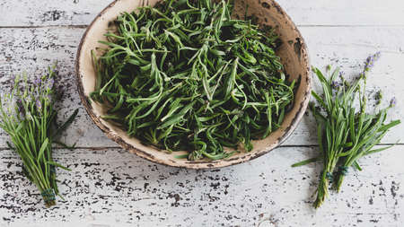 Raw fresh tarragon bunch, on old wooden background, top view with space for text