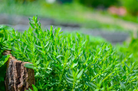 Tarragon or Estragon green leaves growing from the soil in the garden. Medicinal and food plant Artemisia or wormwood for lemonade drinks and cooking. Local food gardening, eco organic fresh herbs.
