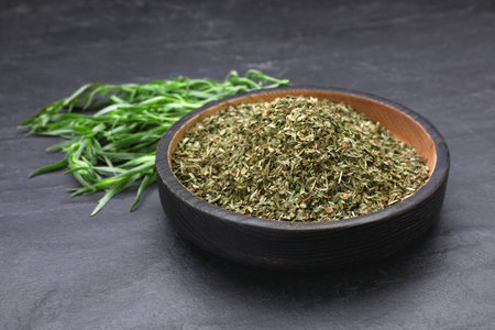Dry tarragon in bowl and green leaves on black textured table, closeup
