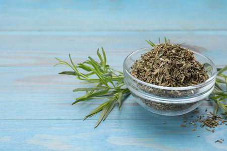 Dry and fresh tarragon on light blue wooden table, space for text